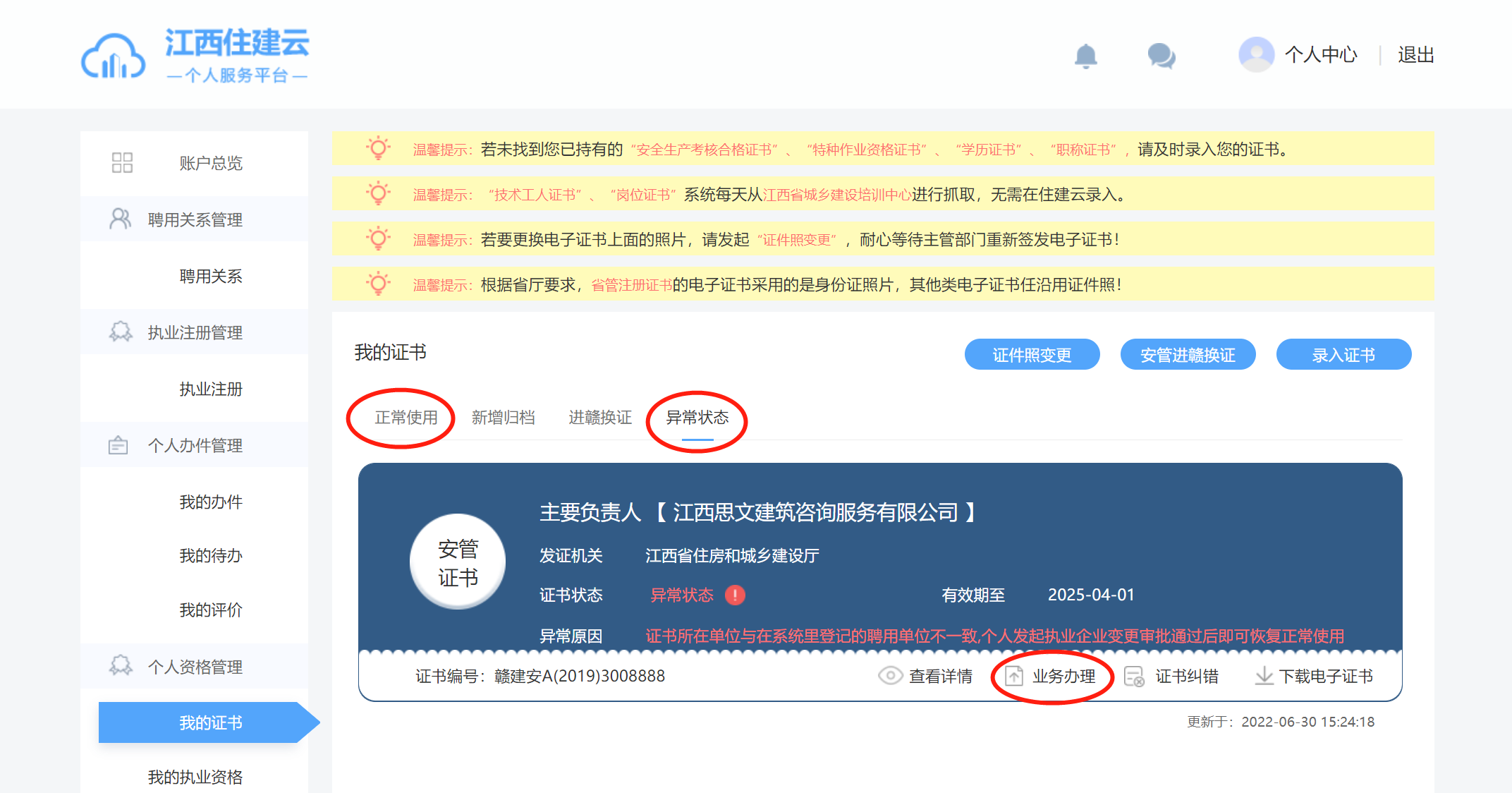 在電腦端登錄“江西住建云個人服務(wù)平臺”,【我的證書】→【異常狀態(tài)】→【業(yè)務(wù)辦理】→【注銷】