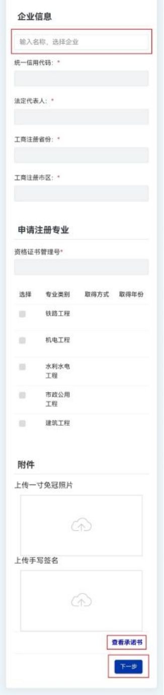 第二步:在“聘用企業(yè)信息”欄目中的企業(yè)名稱輸入框中輸入所受聘企業(yè)的名稱關鍵字(圖9-2),在該輸入框下會提示可選的企業(yè),點擊所受聘的企業(yè)名稱,系統(tǒng)自動提取該企業(yè)的統(tǒng)一信用代碼、法定代表人、工商注冊省份、工商注冊市區(qū);(注:若輸入框下未提示聘用企業(yè)的名稱或系統(tǒng)未提取出該企業(yè)的信息,說明企業(yè)名稱輸入錯誤或該企業(yè)還未在“建設行業(yè)執(zhí)業(yè)資格管理信息系統(tǒng)”(點擊進入)完成注冊和實名認證)