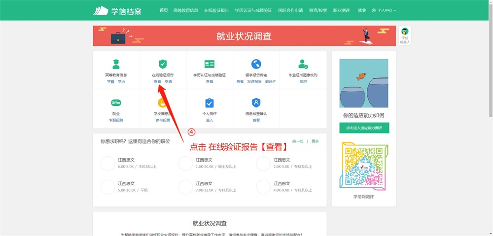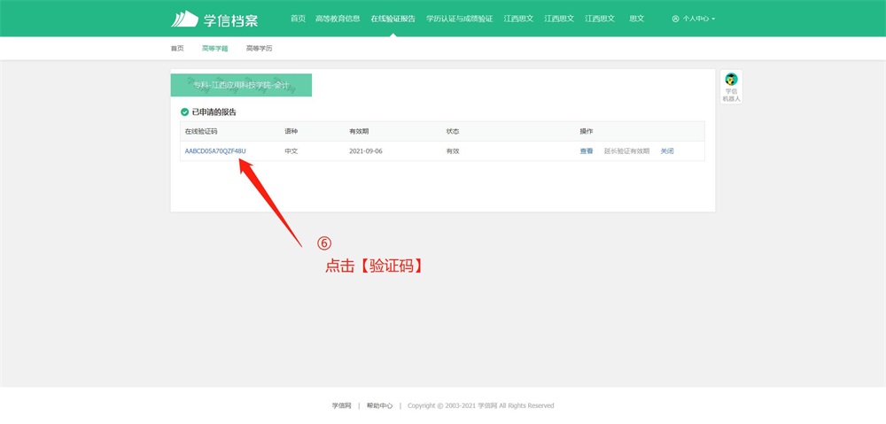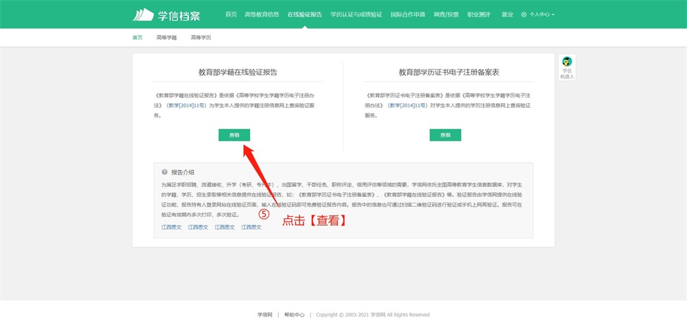 第二步,成功登錄后,點(diǎn)擊頂部菜單中的“在線驗(yàn)證報(bào)告”欄目,可申請(qǐng)《教育部學(xué)籍在線驗(yàn)證報(bào)告》。